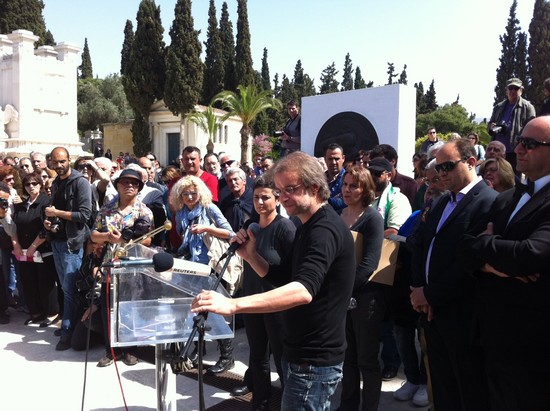 Στην τελετή ακούστηκε μήνυμα του Μίκη Θεοδωράκη ενώ αίσθηση έκανε ο αποχαιρετισμός της κόρης του που τον προσφώνησε «πατέρα και σύντροφο» .